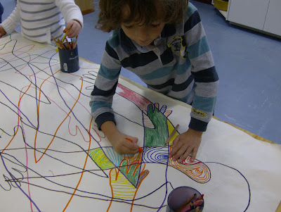 Começamos a trabalhar o corpo humano com relaxamentos, fizemos exercícios que nos ajudam a sentir os nossos ossos e os ossos dos amigos.No papel cenário desenhamos os nossos corpos.